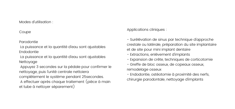Equipé de 2 pièces à main LED + 14 inserts en titane (compatibilité MECTRON / WOODPECKER) Bone surgery : US1, US1L, US1R, US2, US3, US4, US5, Implant : UI2 Exelcymosis : UC1 Sinus Lifting : UL1, UL2, UL3, UL4, UL5