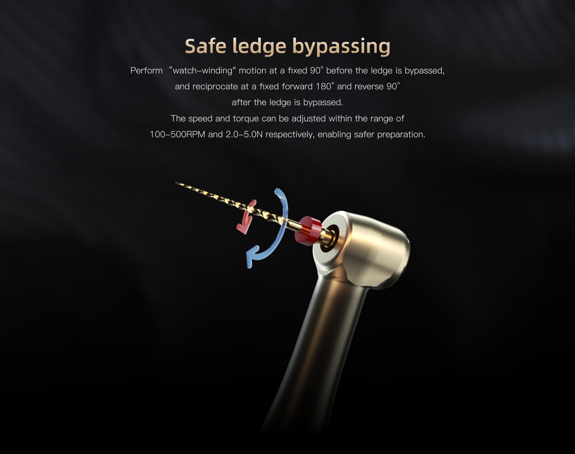 Comment ça marche ? Progressez en réciprocité (90°/90°) à basse vitesse, puis d'une simple pression sur le bouton principal, passez au mode de traitement souhaité (réciprocité ou rotation continue) pour continuer votre mise en forme.