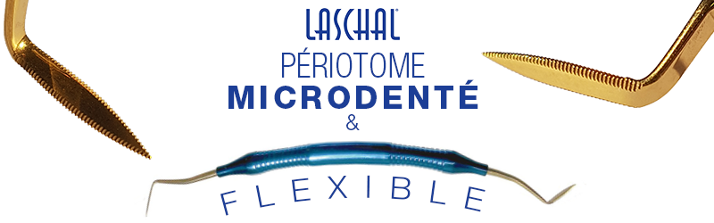 Le périotome micro dentelé de Laschal, enduit de nitrure de titane (TiN), permet une séparation simple et efficace du ligament parodontal.