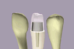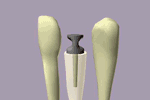 Dans le cas d'un Inlay-Core à clavette, le praticien devra simplement fractionner le faux-moignon en autant de segments que de tenons. En fait, dans la majeure partie des cas, la clavette se descelle spontanément du faux moignon pendant cette opération de fractionnement.