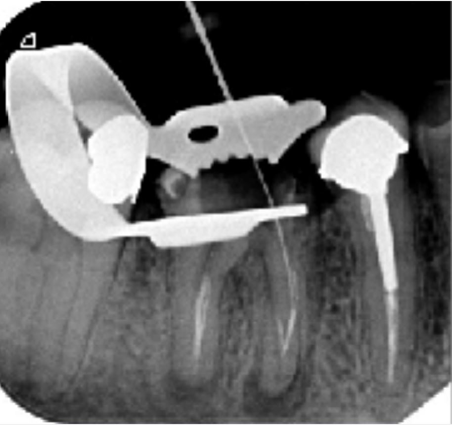 Radio Per-Opératoire Désobturation progressive du système canalaire à l'aide de séquence FANTA RETREATMENT Mise en évidence d'un fragment instrumental dans la racine MV de la 46 Retrait du fragment à l'aide d'inserts endodontiques