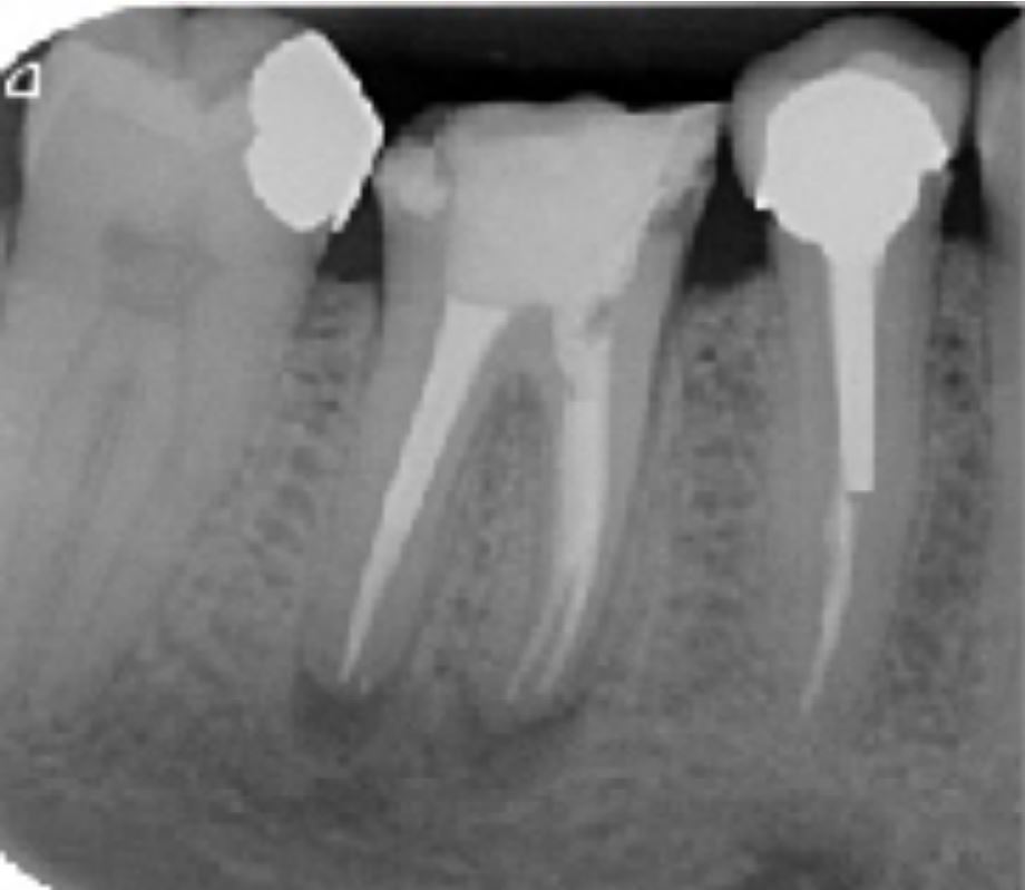 Radio post-opératoire Alésage du système canalaire à l'aide de la séquence FANTA BLUE S4 Rotary jusqu'à la lime 35/04 Lime apical maitresse de 35/100ème Obturation Gutta et Ciment Zinc Eugénol Thermocompactage avec canal accessoire dans le canal distal