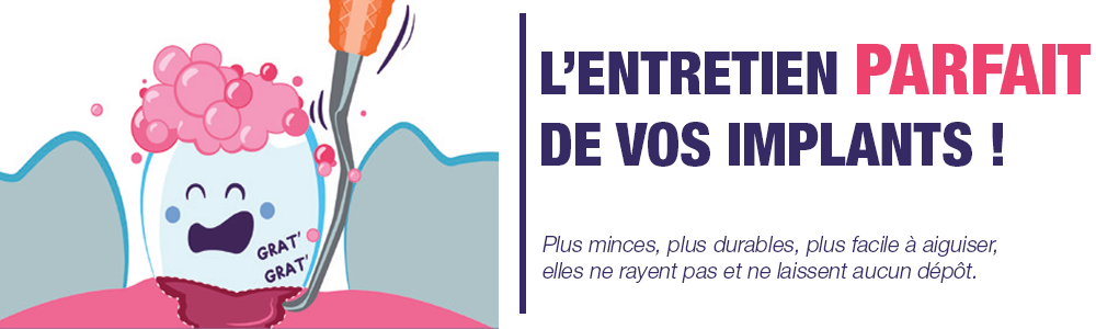 NB : N'affûtez pas vos instruments en titane sur une pierre ayant servi à affûter d'autres matériaux. Le titane de la lame en serait contaminé et risquerait d'endommager les implants par la suite. Pour cela, un kit vous est proposé, réunissant 3 instruments destinés à la maintenance implantologique, une sonde en thermoplastique (de votre choix) et une pierre en céramique diamantée entièrement dédiée à l'affûtage de votre instrumentation en titane.