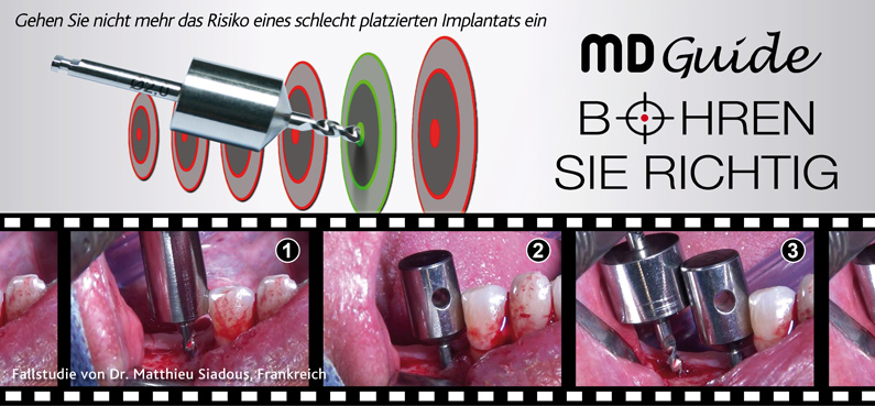 Dieser Platzhalter simuliert die künftige Krone und kann damit auch als Stütze für die nächste Bohrung mit einem geeigneten MD Guide dienen (Abb. 3). Auf diese Weise können Sie einen ganzen Zahnbogen rekonstruieren! So erspart Ihnen MD Guide die Realisierung und Verwendung einer Bohrschablone zu diesem Zweck.