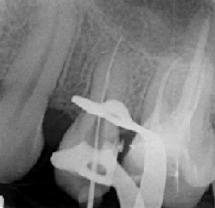 Première molaire 16 présentant une image radio-claire au regard des racines mésiales et palatines