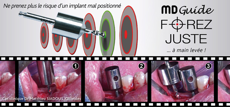 L'imagerie 3D vous permet de réaliser 2 choses : votre plan de traitement et un guide chirurgical. Le guide chirurgical est à usage unique, n'est pas stérile et empêche toute irrigation de la pointe du foret. Dans une très grande majorité de cas, MD Guide peut constituer une excellente alternative au guide traditionnel. MD Guide est réutilisable, stérile et ne nécessite aucune prise d'empreinte. De plus, il permet une irrigation de la pointe du foret supérieure à celle d'un foret passé à travers une gouttière. En revanche, l'imagerie 3D vous permettra de choisir au mieux le diamètre de chaque foret au fil de l'opération.