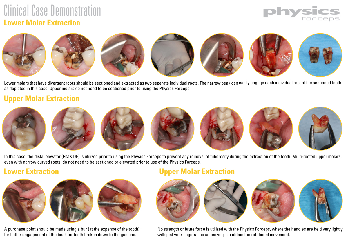 The Physics Forceps® are effective in most cases, including badly decayed or broken down teeth, endodontically treated teeth, fractured or fragile teeth, curved or long rooted molars and cuspids, or any tooth that would historically be challenging with conventional instrumentation. The Physics Forceps® are ideal for implantologist that wants to preserve the surrounding bone and tissue in preparation for dental implants.