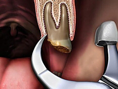 The Physics Forceps® requires no squeezing, pulling, or grabbing. Instead, once in position the handles are rotated toward the facial aspect of the tooth. The Physics Forceps® require two opposing forces. The first force is placed into the lingual sulcus of the tooth below the gingival with the beak. The second force is placed on the alveolar ridge with the bumper. Therefore there is only one point of contact on the tooth with the Physics Forceps. These two opposing forces cancel the need for a third force. If the crown is missing or the tooth is decayed there is no need to lay a flap because these same principles apply.