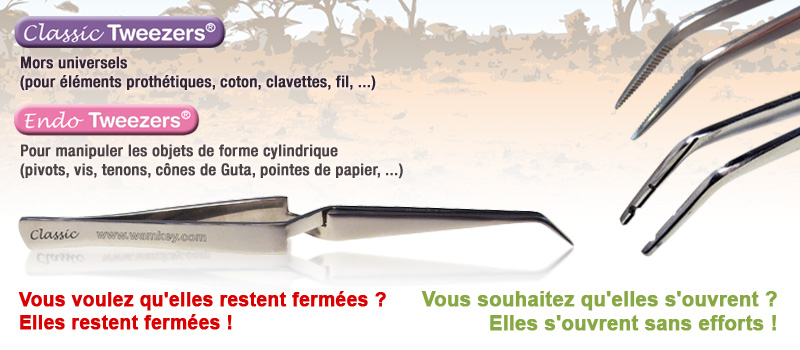 Les Endo-Tweezers sont dotées de gorges longitudinales et transversales permettant une manipulation aisée des petits objets de formes allongées et plus particulièrement des tenons, des pointes de papier, des cônes de gutta-percha, etc.